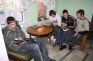 Sēmes pamatskolas devītie – Raimonds Augstkalns, ……, Mārtiņš Šermūksītis un Ralfs Balodis – sēž skoliņas priekštelpā. Šķirsta žurnālus. Mājturības stunda izpalikusi, skolotājs nobastojis…