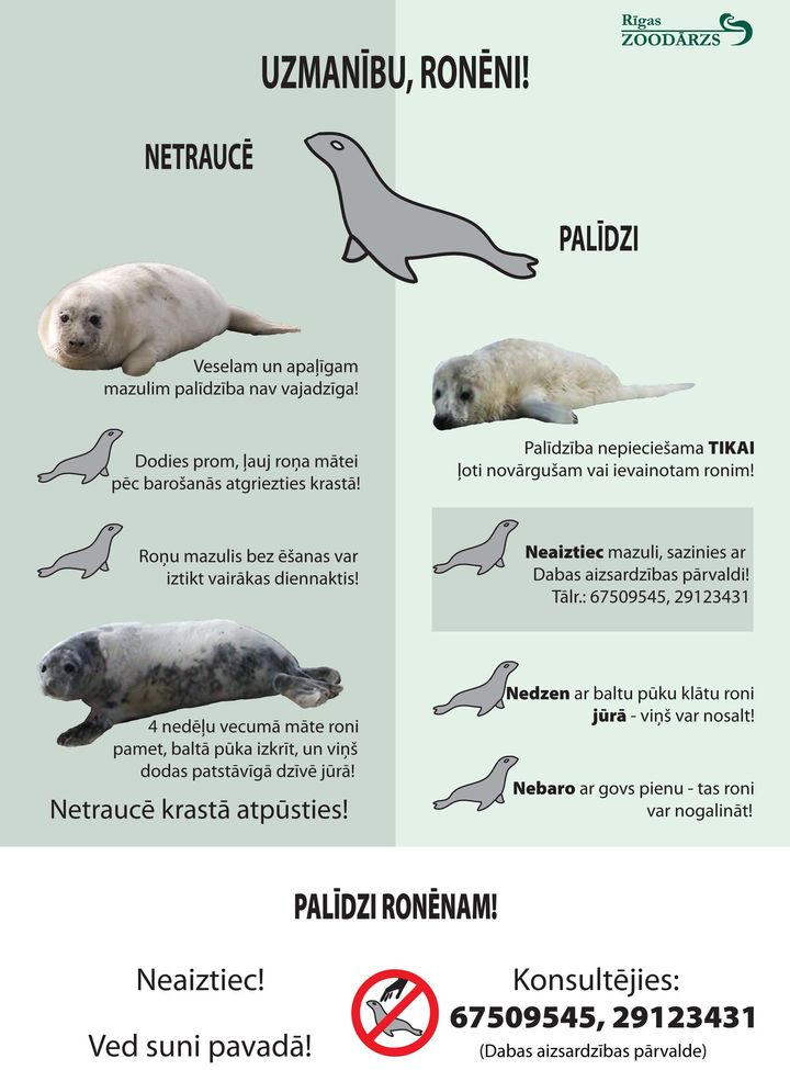 Jāņem gan vērā, ka ne katram pludmalē atrastam roņu mazulim vajadzīga palīdzība. Ja ronēns jau sācis mainīt (uz galvas, muguras) balto, garo pūku tērpu pret īsu, pelēku vilnu, visticamāk, tas jau uzsācis patstāvīgu dzīvi un labākais, ko šādā gadījumā darīt – paņemt suni pavadā un mazulim netraucēt. Tāpat palīdzība nav vajadzīga apaļīgam un ņipram mazulim, kuru vēl klāj baltā pūka, jo, iespējams, tas gaida māti. Tad pareizākais – steigšus attālināties.