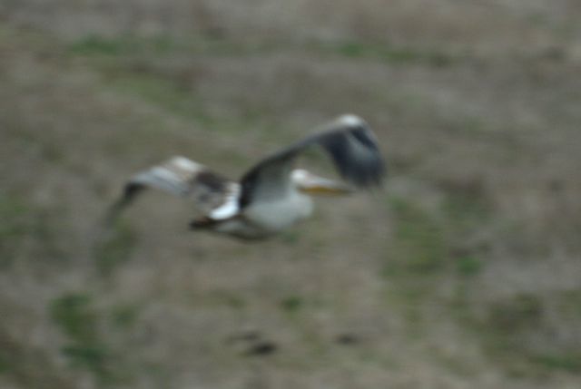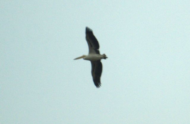 It kā jau pirmais aprīlis garām, un cilvēks neizklausījās arī pēc tāda, kuram darbdienas vidū pirms Lieldienu svētkiem jau pelikāni rādās. Braucām lūkot. Norādītajā vietā – pie Lazdām, kur vecais Kandavas ceļš piekļaujas Ventspils šosejai, uz lauka metrus 300 no ceļa, tiešām ieraudzījām dīvaino viesi – sēdēja sarāvies un laikam jau nosalis. Kad mēģinājām putnam tuvoties, tas savicināja savus milzu spārnus un lēni kā «Boings» uzņēma augstumu, lai planējumā pievienotos laimīgajam «Sildārziņu» stārķu pārim. Novērojām arī, kā stārķi atgriezās ligzdā, bet pelikāns cēlās aizvien augstāk un augstāk, līdz izzuda skatienam.
