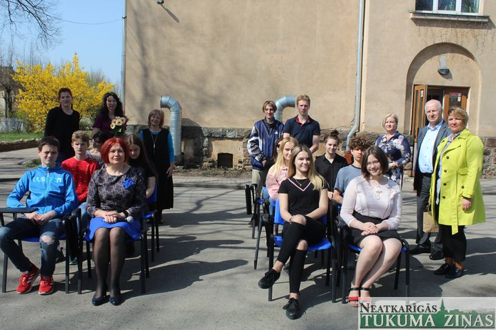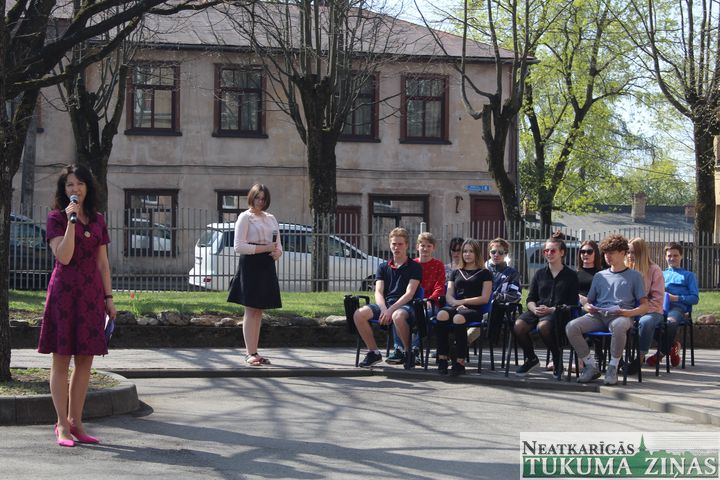 To, sasēduši košzilos krēslos ar nolaižamām rakstāmplāksnēm, demonstrēja 9. klase un skolotāja Zaiga Širina. Tieši viņas iecere bija kopā ar Tukuma Raiņa ģimnāzijas atbalsta biedrību iesniegt projektu «Cemex» iespēju fondā, kā arī lūgt līdzfinansējuma atbalstu Tukuma novada domei, lai skolēniem un skolotājiem būtu iespēja paņemt krēslus un vienā mirklī iekārtot klasi ārā, īpaši jau tik skaistā dienā, kāda bija aizvadītā piektdiena. Tāds bija arī daudzo apsveicēju vēlējums – lai uz šiem krēsliem veidotos rinda un lai skolā bieži skanētu vārdi: “Skolotāj, mēs gribam ārā!”