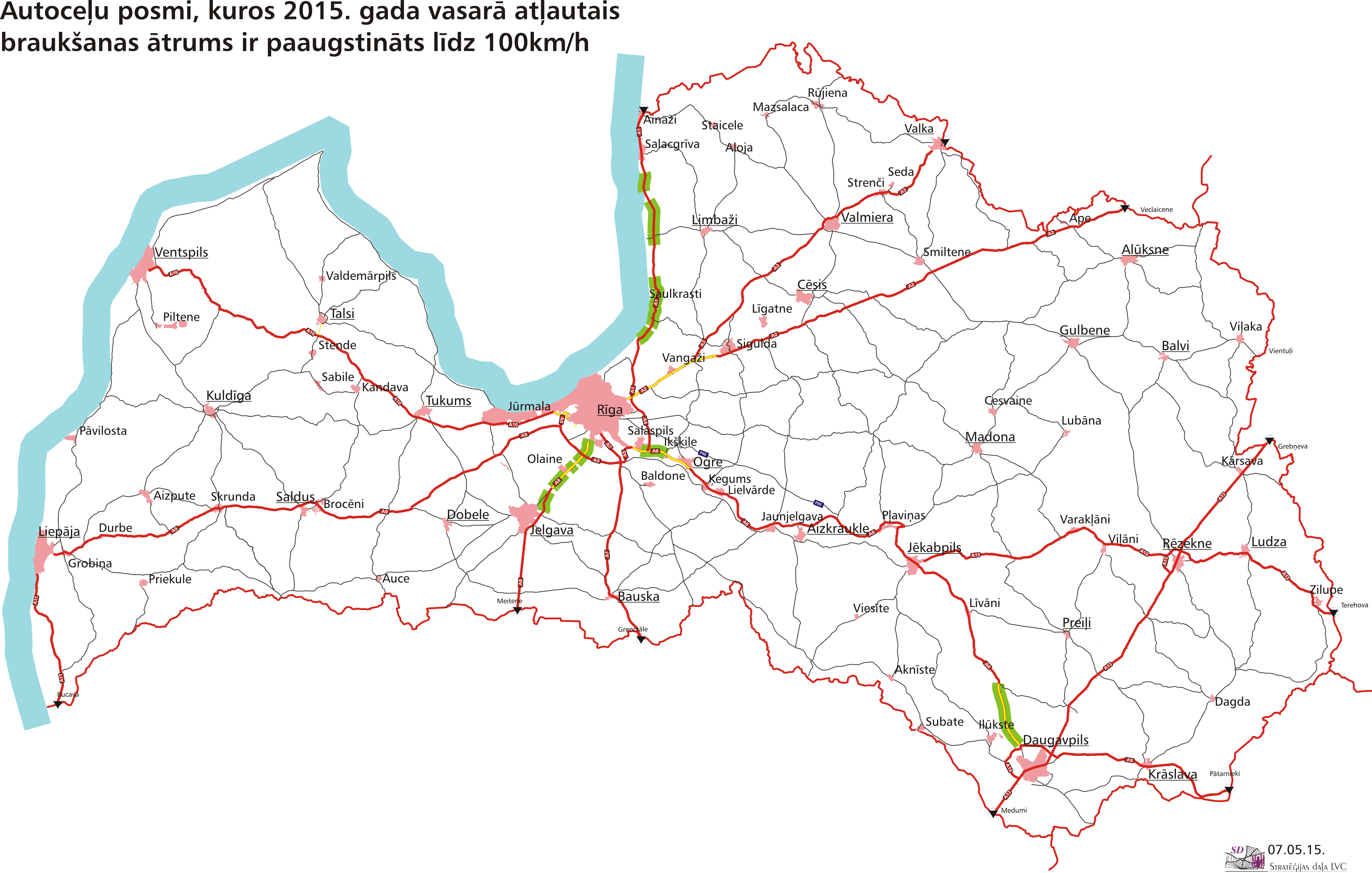 Kā zināms, uz valsts galvenajiem ceļiem posmos, kuri ir labā tehniskā stāvoklī, vasarā maksimāli pieļaujamais braukšanas ātrums tiek palielināts līdz 100 km/h. Arī šogad no 8. maija atļautais braukšanas ātrums būs palielināts šādos ceļu posmos: