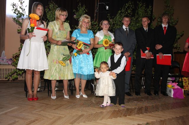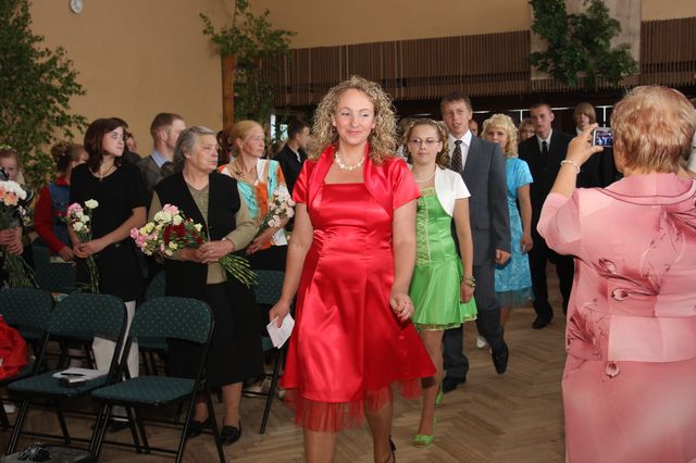Klases audzinātāja Baiba Rasa ieved absolventus. Kājās piecēlušies, dzied himnu «Dievs svētī Latviju». Uzrunu teic direktore Ilze Rasa. Runā par varavīksni pār ezeru. Par krāsām septiņām, kuras tajā iezīmējis kāds no septiņiem absolventiem – Jānis Bezdelīga, Baiba Dakša, Juris Dakša, Kristaps Holšteins, Ilona Krūtaine, Elīna Miķelsone un Linda Rasa.
