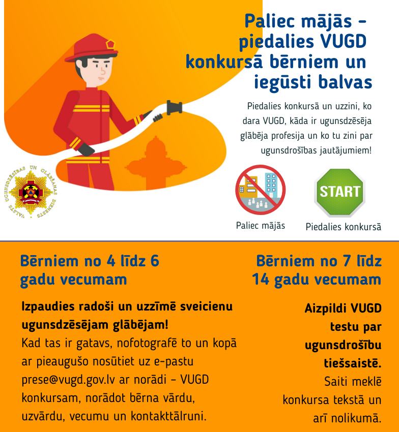 - bērniem no 4 līdz 6 gadu vecumam jāuzzīmē zīmējums par tēmu «Sveiciens ugunsdzēsējam glābējam!» (Šogad 17. maijā Ugunsdzēsībai Latvijā aprit 155 gadi, tā kā šī ir lieliska iespēja ugunsdzēsējus glābējus apsveikt profesionālajos svētkos!);