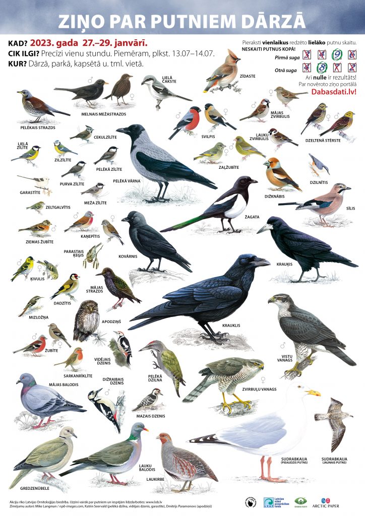 Lai apzinātu, kur un kādas putnu sugas Latvijā sastopamas ziemas mēnešos, Latvijas Ornitoloģijas biedrība no 27. līdz 29. janvārim aicina ikvienu stundas garumā piedalīties akcijā “Ziņo par putniem dārzā 2023”.  Šajos pašos datumos pēc vienotas metodikas putnus skaitīs gan kaimiņvalstīs,  gan citviet Eiropā.