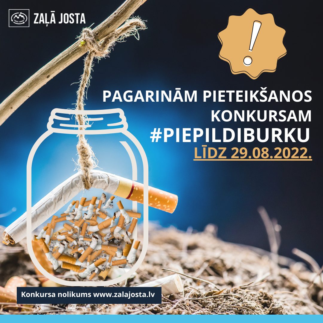 Izaicinājuma konkurss #PiepildiBurku ir pagarināts līdz 29.08.2022. Šīs nedēļas laikā konkursa dalībnieku uzdevums ir ņemt stikla burku, doties dabā, salasīt tajā zemē nomestos izsmēķus, nofotografēt savu veikumu un kopā ar aizpildītu pieteikuma formu nosūtīt uz e-pastu konkurss@zalajosta.lv. Salasītos izsmēķus jāizber sadzīves atkritumu konteinerā. Tukšo stikla burku jānodod pārstrādei, izmetot to konteinerā stiklam. Bet draugi – jāmotivē sekot labajam piemēram, publicējot veikumu sociālajos tīklos ar mirkļabirku #PiepildiBurku. Visa informācija un konkursa nolikums publicēts “Zaļā josta” mājaslapā www.zalajosta.lv un projekta vietnē www.nemetzeme.lv. Vērtīgāko paveikto darbu autori saņems noderīgas balvas atpūtai pie dabas – universālu guļamtīklu un termosu, lai dotos baudīt dabu jebkuros laikapstākļos, taupot resursus, neradot atkritumus un saudzējot vidi.