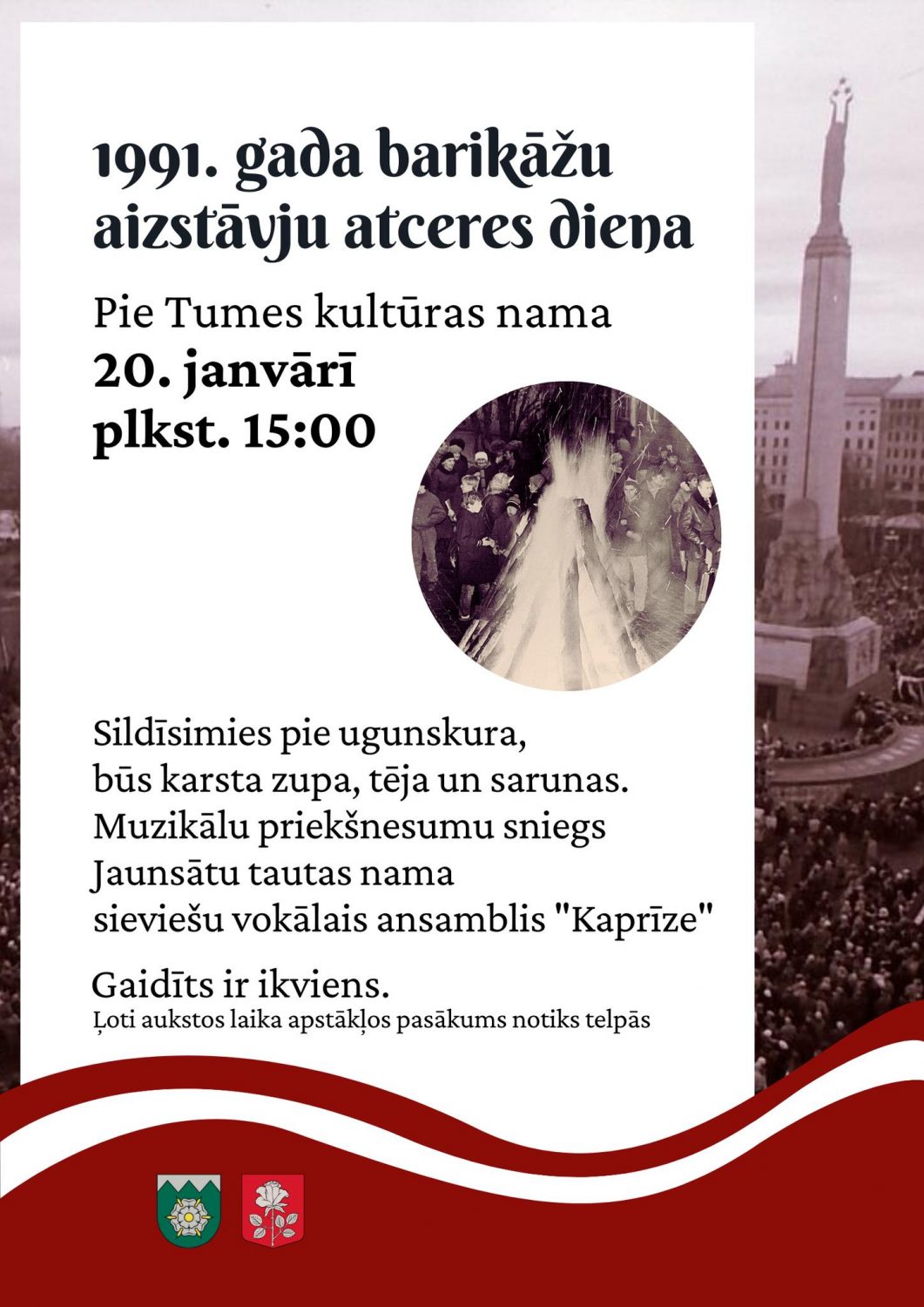 Barikāžu aizstāvju atceres diena 20.janvārī pulksten 15:00 būs arī pie Tumes kultūras nama. Te būs iespēja sildīties pie ugunskura ar zupu, siltu tēju un sarunām. Muzikālu priekšnesmu sniegs Jaunsātu tautas nama sieviešu vokālais ansamblis “Kaprīze”.