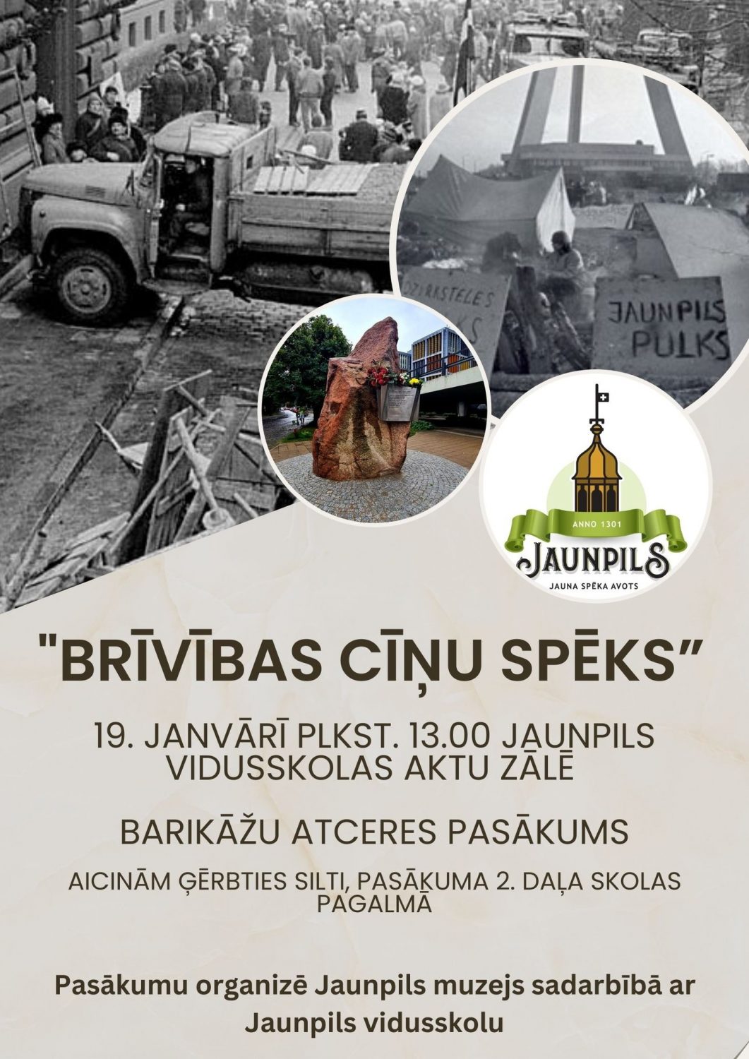 19.janvārī pulksten 13:00 uz Barikāžu atceres pasākumu aicina Jaunpils muzejs Jaunpils vidusskolas aktu zālē. Pasākuma otrā daļa notiks skolas pagalmā, tāpēc pasākuma apmeklētāji aicināti ģērbties silti.