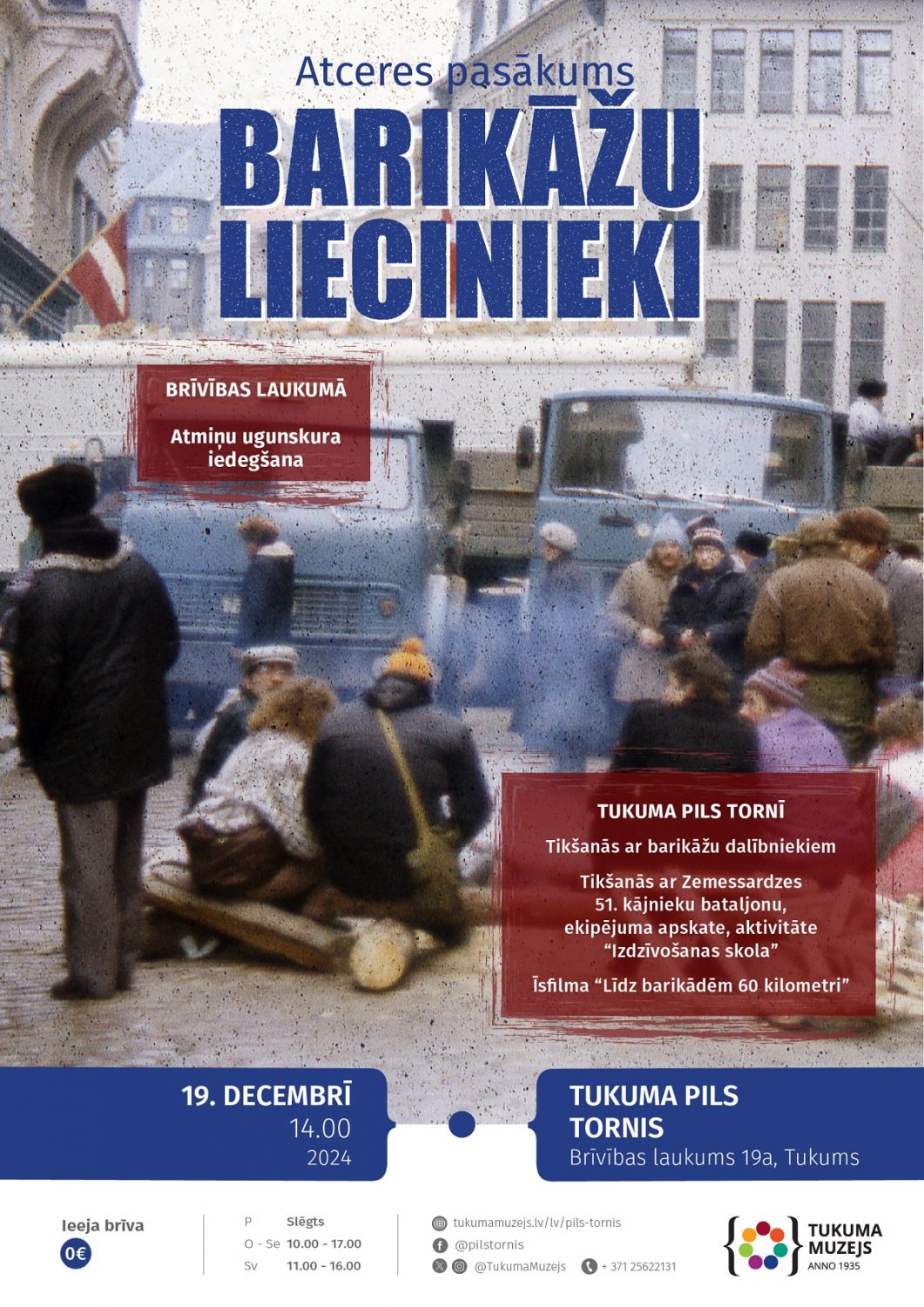 Tukuma muzeja Pils tornis aicina 19.janvārī pulksten 14:00 būt kopā Tukuma pilsētas Brīvības laukumā, kur, Barikāžu laiku atceroties, tiks iedegts Atmiņu ugunskurs. Gaidīti arī Barikāžu dalībnieki, lai dalītos ar pašu piedzīvoto. Laikā no 19.līdz 21.janvārim Tukuma Pils tornī būs iespēja noskatīties video materiālu, atceroties Barikāžu laika spraigos notikumus.