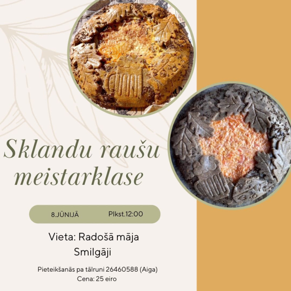 Vasaras saulgriežu gaidās, 8.jūnijā pulksten 12:00 aicinām apgūt Vānes “Smilgāju” iecienīto sklandu raušu versiju aplocītā pīrāga veidā. Meistarklasē katrs gatavos savu rausi ar divu veidu pildījumu, maliņas rotās ar mīklas lapiņām, ziediņiem, alus kausiņiem, izmantojot Trik’design formas. Pieteikšanās pa tālruni 26460588. Adrese: “Smilgāji”, Vānes pagasts, Tukuma novads.