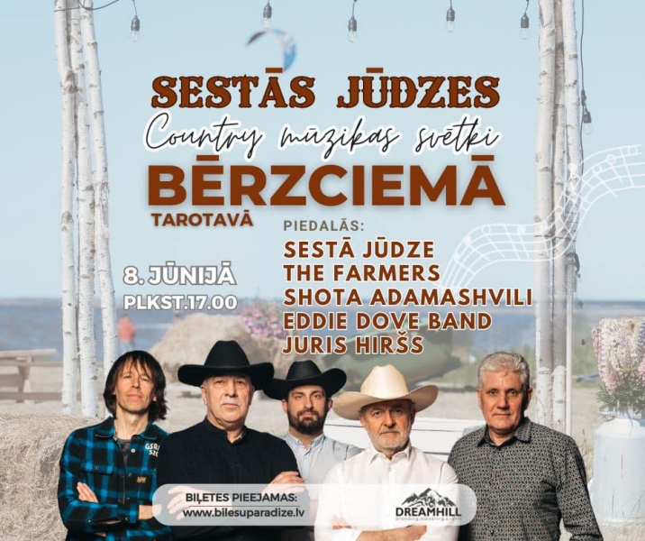 8.jūnijā būs “Sestās jūdzes” country mūzikas svētki Bērzciema tarotavā jau no pulksten 17:00. Svētkus muzikāli papildinās – grupa “Sestā jūdze”, “The Farmers”, Shota Adamashvili, Eddie Dove Band, kā arī Juris Hiršs. Biļetes iegādājamas www.bilesuserviss.lv. Adrese: Bērzciema tarotava, Bērzciems, Engures pagasts, Tukuma novads.