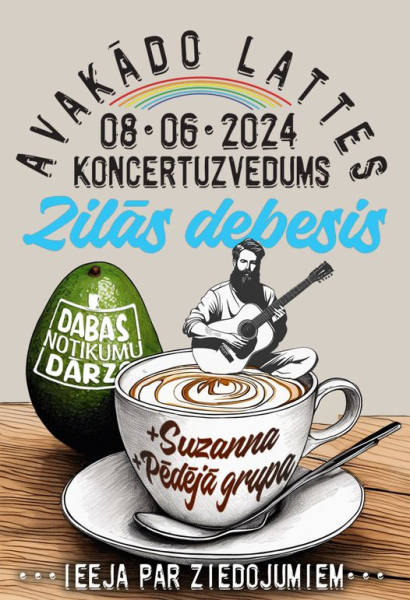 1. jūnijā pulksten 18.00 Dabas Notikumu Dārzā būs “Avakādo Latte” koncertuzvedums “Zilās Debesis”. Pasākuma programmā arī jaunā un daudzsološā dziedātāja Suzanna, kā arī grupa “Pēdējā Grupa”. Ieeja par ziedojumiem. Adrese: “Vagas”, Jaunpils pagasts, Tukuma novads.