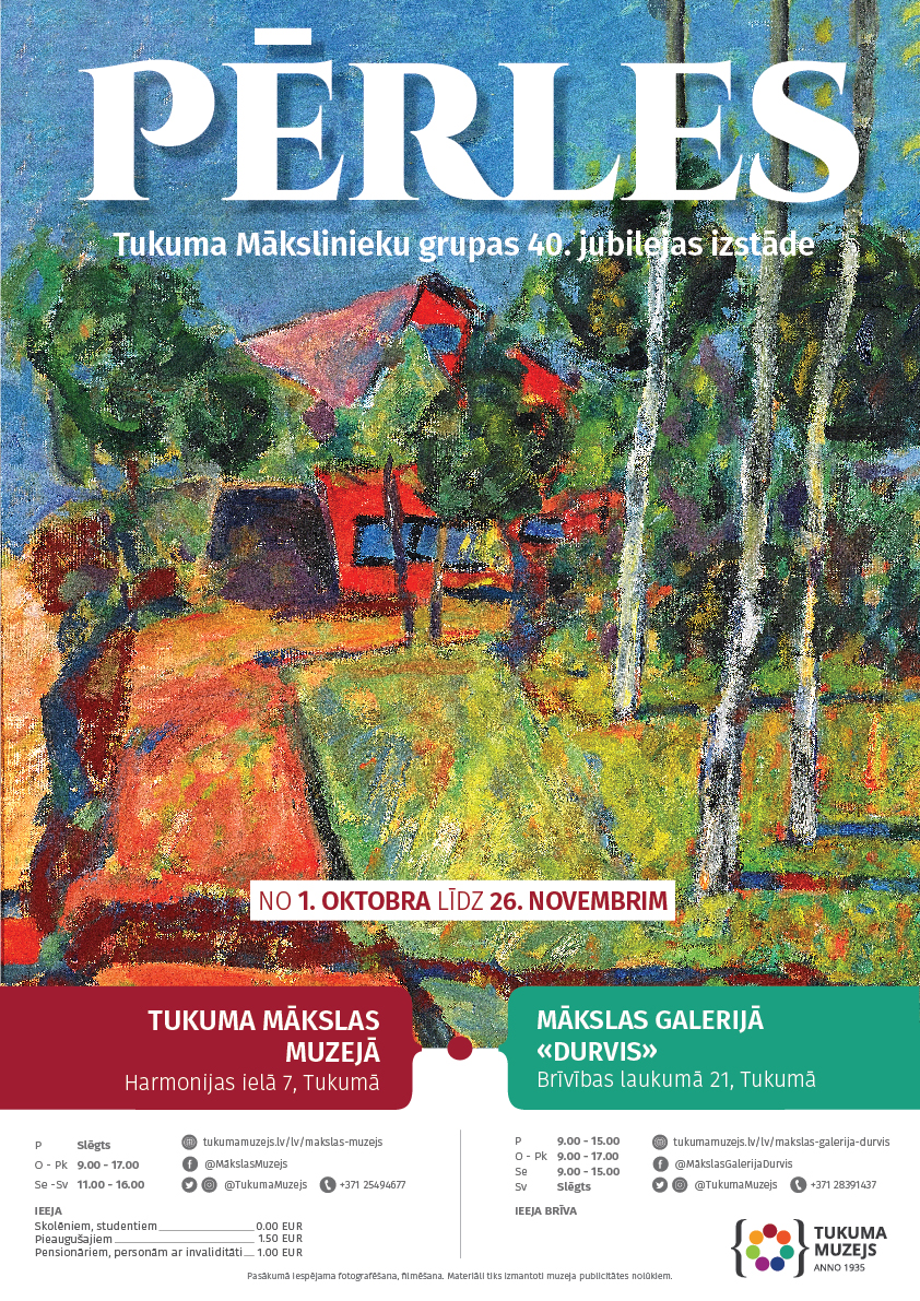 Tukuma Mākslas muzejā un Mākslas galerijā “Durvis” skatāma divdaļīgā izstāde “Pērles”. Izstāde tapusi, atzīmējot Tukuma Mākslinieku grupas 40. jubileju. Šajā jubilejas izstādē mākslinieki parāda savus darbus, kas raksturo katru autoru, tā radot daudzkrāsainu iespaidu par tik atšķirīgo mākslinieku raksturu, dzīvi un pieredzi.
