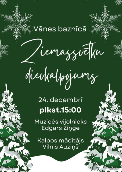 Vānes luterāņu baznīcā Ziemassvētku dievkalpojums būs 24.decembrī pulksten 15:00. Muzicēs vijolnieks Edgars Ziņģe.