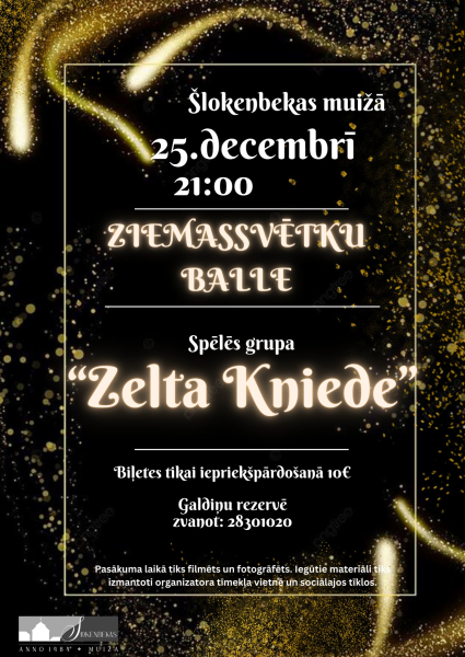 Ziemassvētku balle Šlokenbekas muižā būs 25.decembrī no pulksten 21:00. Par mūziku ballē rūpēsies grupa “Zelta kniede”.