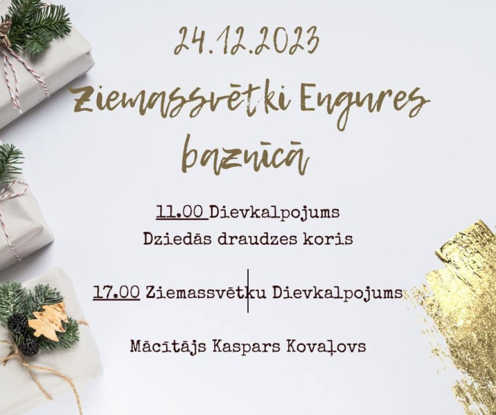 Engures luterāņu baznīcā 24.decembrī pulksten 11:00 būs dievkalpojums ar draudzes kora dziedājumu, bet pulksten 17:00 – Ziemassvētku dievkalpojums.