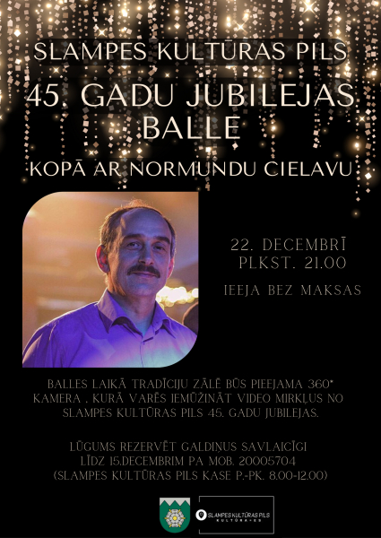 Slampes Kultūras pils aicina uz savu 45 gadu jubilejas svētku balli kopā ar Normundu Cielavu 22.decembrī pulksten 21:00. Balles laikā Tradīciju zālē būs pieejama 360 grādu kamera, kurā būs iespēja iemūžināt video mirkļus no jubilejas pasākuma.