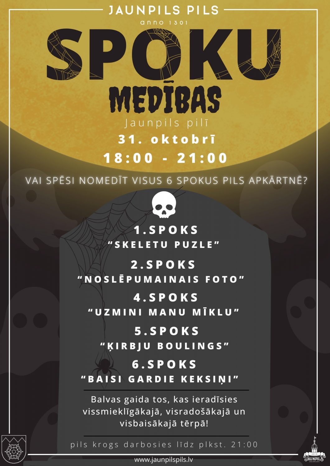 Jaunpils pilī vakars pārvērtīsies par noslēpumainu piedzīvojumu starp gariem un rēgiem. Apmeklētājus sagaidīs dažādi pārbaudījumi, rēgainas spēles un radošās darbnīcas. Pils kambaros valdīs spocīga gaisotne, kur sastapsies drosme, iztēle un tumsa. Tērpu parāde ļaus izcelt oriģinālākos tēlus, bet pils krogs piedāvās gardu maltīti pēc piedzīvojumiem. Šeit Helovīna gars atklāsies ar vēstures elpu un piedzīvojumu noskaņu.