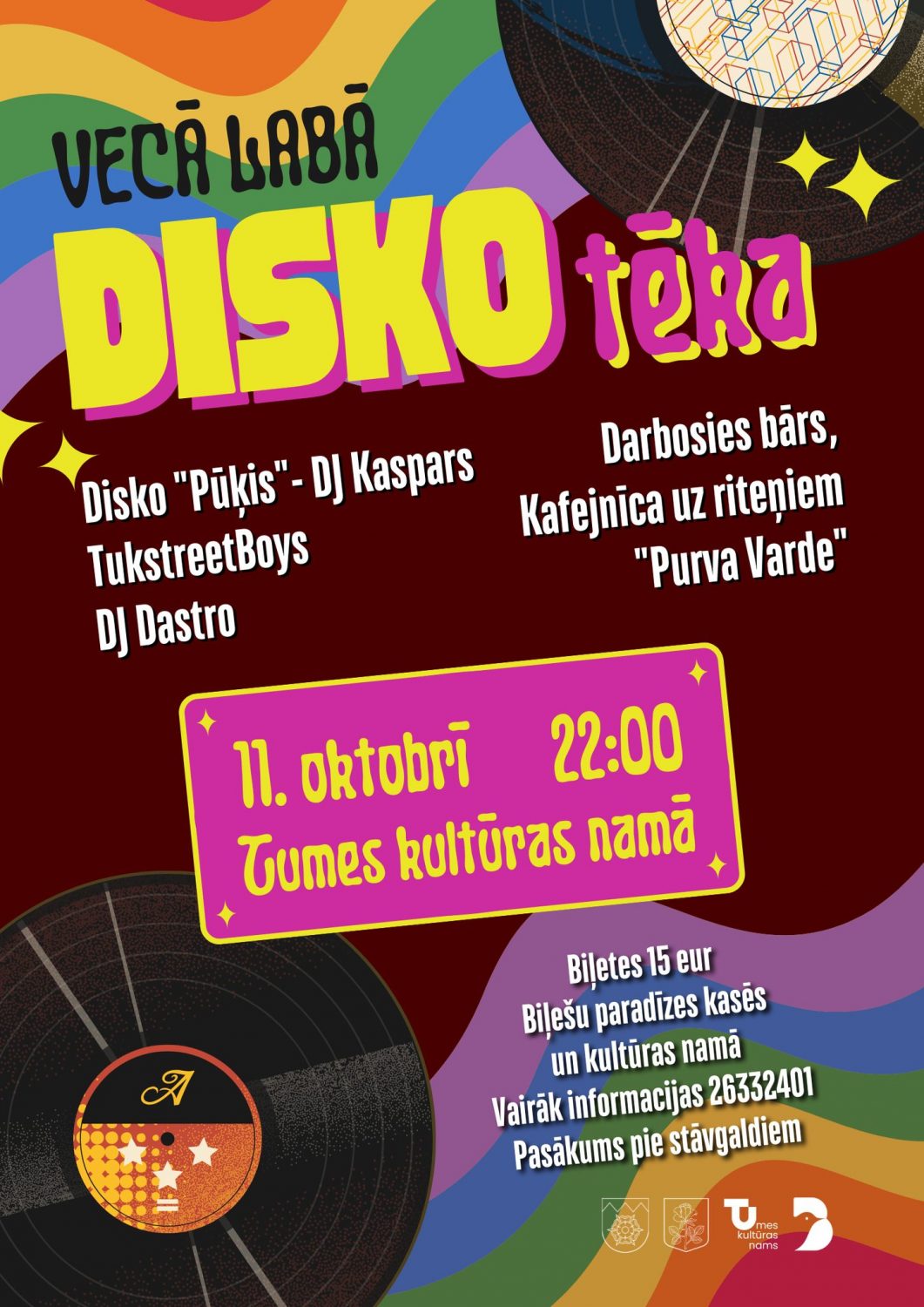 Klasiskā diskotēkas enerģija atgriežas jaunā formātā, kur mūzika un dejas neapstāsies ne mirkli. DJ Kaspars, TukstreetBoys un DJ Dastro radīs īstu ballītes sprādzienu, piešķirot dejām īpašu ritmu. Atmosfēru papildinās stāvgaldiņi, bārs un mobilā kafejnīca “Purva Varde”, kas ļaus izbaudīt vakaru pilnībā. Norises vieta: Tumes kultūras nams, Pasta iela 1A, Tume, Tumes pagasts, Tukuma novads. Norises laiks: 11.10.2025 plkst. 22:00. Vairāk informācijas: 26332401