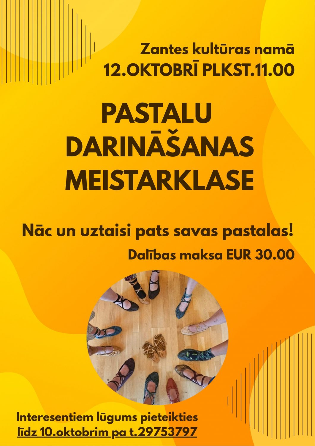 Radošā nodarbība dos iespēju pašam radīt savas unikālas pastalas. Katrs solis ļaus izpaust savu stilu un radīt praktisku, māksliniecisku darbu. Gatavie darbi kļūs par īpašu aksesuāru, kas saglabās katra paša radošās ieceres noskaņu. Norises vieta: Zantes kultūras nams un bibliotēka, Skolas iela 6, Zantes pagasts, Tukums. Norises laiks: 12.10.2025 plkst. 11:00. Vairāk informācijas: 29753797