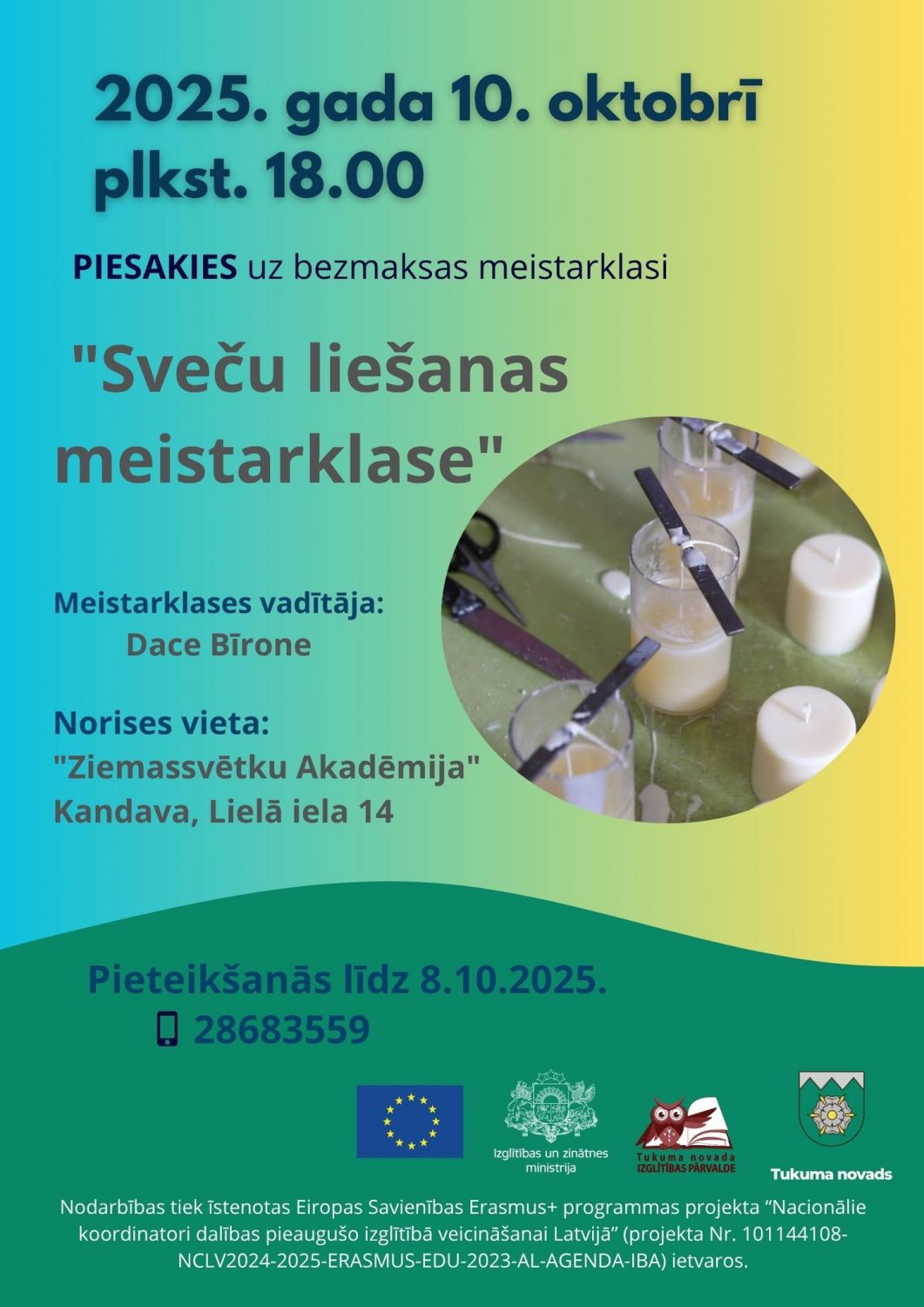 Atklāj sveču tapšanas burvību, liekot kopā vasku, krāsas un smaržas. Radošais process piedāvās mierpilnu un iedvesmojošu pieredzi, kas ļaus radīt unikālas, personiskas sveces. Gatavie darbi kļūs par skaistu interjera akcentu un sirsnīgu roku darbu ar īpašu noskaņu. Norises vieta: “Ziemassvētku akadēmija”, Lielā iela 14, Kandava, Tukuma novads. Norises laiks: 10.10.2025 plkst. 18:00. Dalības maksa: Bez maksas. Vairāk informācijas: 28683559