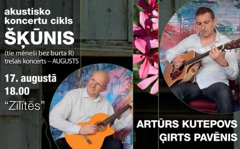 Noslēdzošajā akustisko koncertu cikla “ŠĶŪNIS” koncertā uzstāsies Latvijas ģitārspēles meistari Artūrs Kutepovs un Ģirts Pavēnis. Klausītāji varēs baudīt īpaši sagatavotu programmu un rīkot savu mazo pikniku lauku sētas dārzā. Vakarā tiek piedāvāta intīma un emocionāli bagāta mūzikas pieredze. Koncerts ienesīs unikālu akustisko skanējumu un klātbūtnes maģiju. Norises vieta: “Zīlītes”, Smārdes pagasts, Tukuma novads. Norises laiks: 17.08.2025 plkst. 18:00. Vairāk informācijas: 29414473