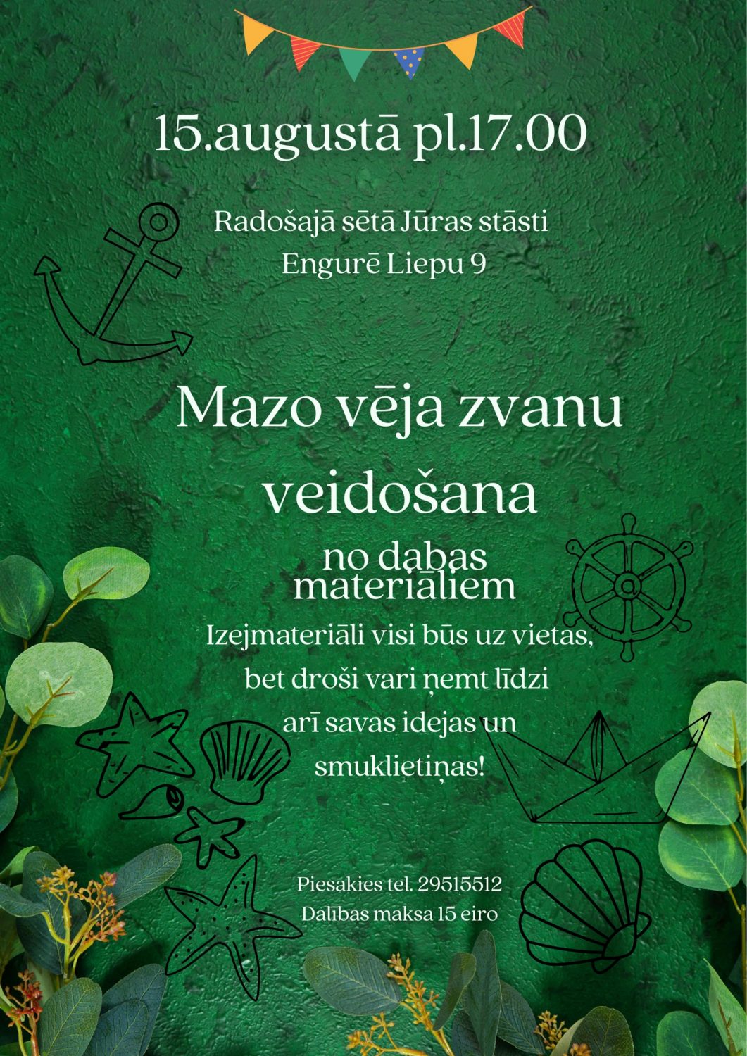 Darbnīca piedāvās iespēju radīt skaistus vēja zvanus no dabas materiāliem. Dalībniekiem tiks nodrošināti materiāli, bet būs iespējams izmantot arī savas lietas, lai padarītu darbu personiskāku. Radošais process apvienos praktiskas prasmes ar estētisku baudījumu. Gatavais darbs kļūs par īpašu interjera vai āra akcentu. Norises vieta: Liepu iela 9, Engure, Engures pagasts, Tukuma novads. Norises laiks: 15.08.2025 plkst. 17:00. Vairāk informācijas: 29515512