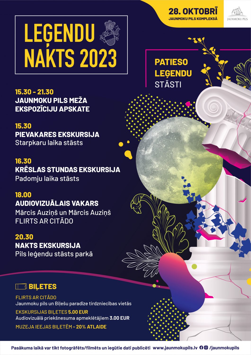 - oktobrī no pulksten 15.30 Jaunmoku pilī apmeklētājus sagaida noslēpumi, tematiskās ekskursijas, audiovizuāls priekšnesums ar divu Mārču Auziņu dalību. Šogad Leģendu nakts vakarā Jaunmoku pils ļaudis ļaus izdzīvot pagātni un tagadni trīs stāstu veidolā.