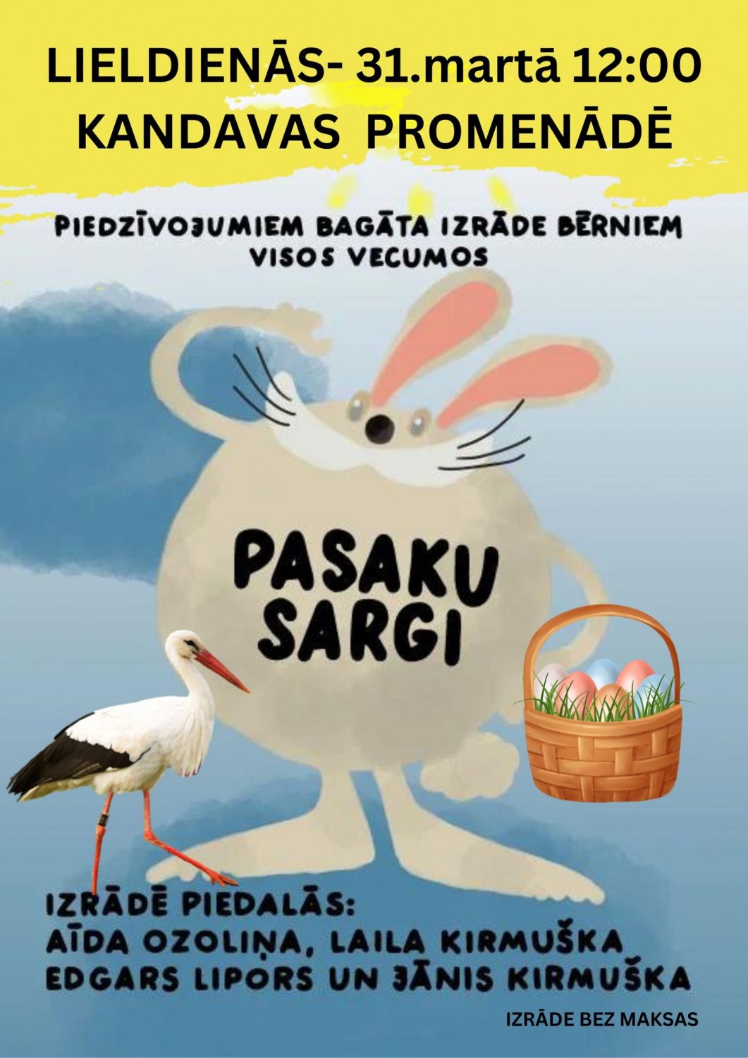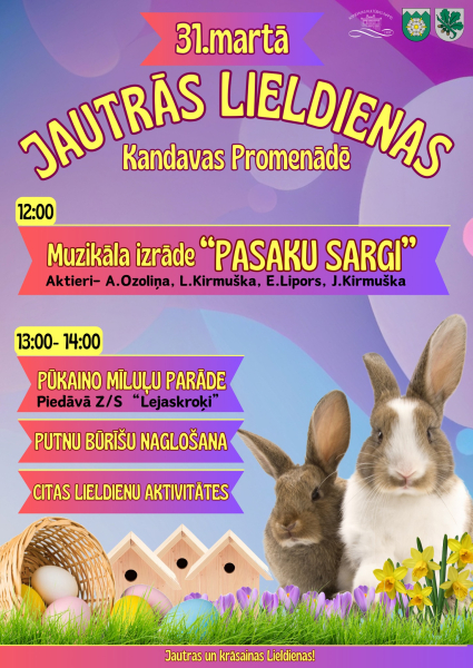 31.martā arī Kandavas Promenādē tiks svinētas Lieldienas. Tās sāksies ar muzikālu izrādi “Pasaku sargi” pulksten 12:00, bet turpināsies ar pūkaino mīluļu parādi, putnu būrīšu gatavošanu un Lieldienu aktivitātēm no pulksten 13:00. Vairāk informācijas www.kandava.lv. A