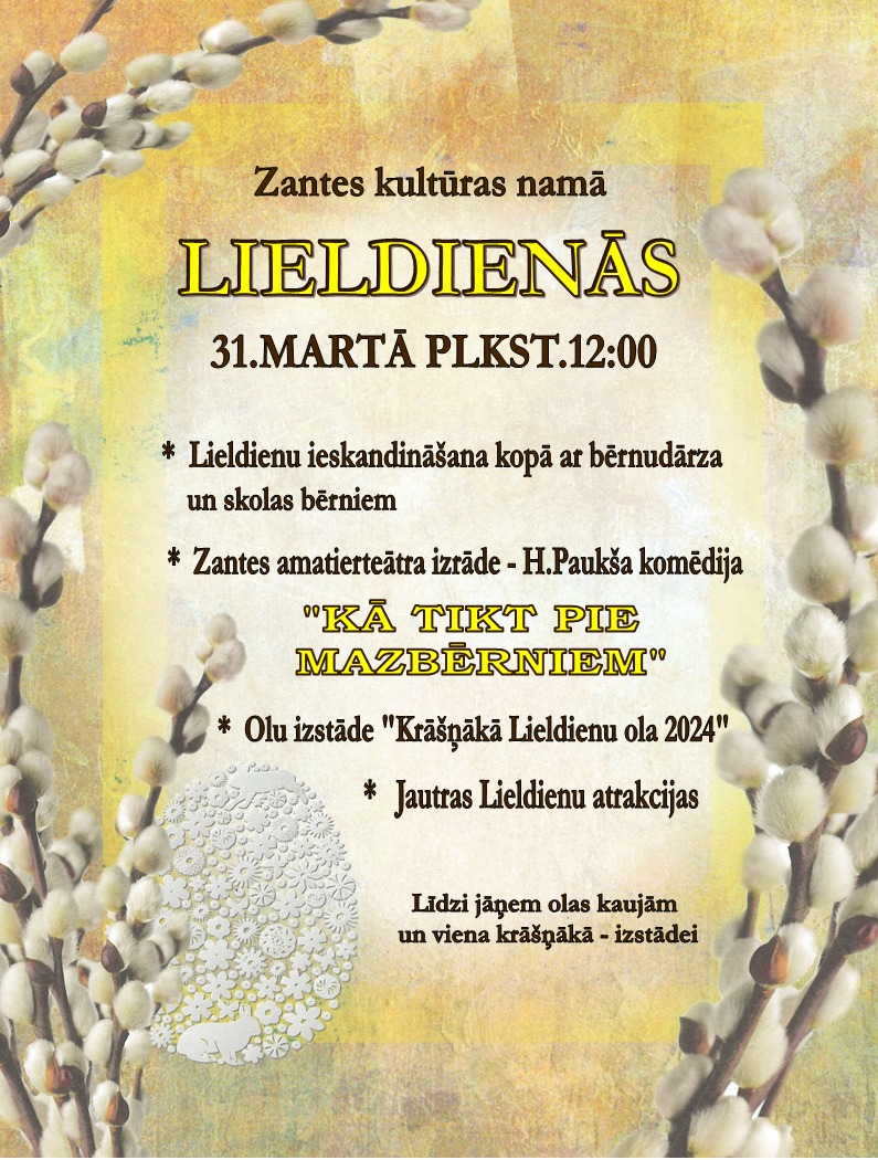 Bet Lieldienas Zantē 31.martā pulksten 12:00 tiks iešūpotas ar pavasarīgu koncertu, jautru teātra izrādi, krāšņu Lieldienu olu izstādi un interesantām atrakcijām! Būs gan koncerts, gan amatierteātra izrāde, gan krāšņākās olas konkurss!
