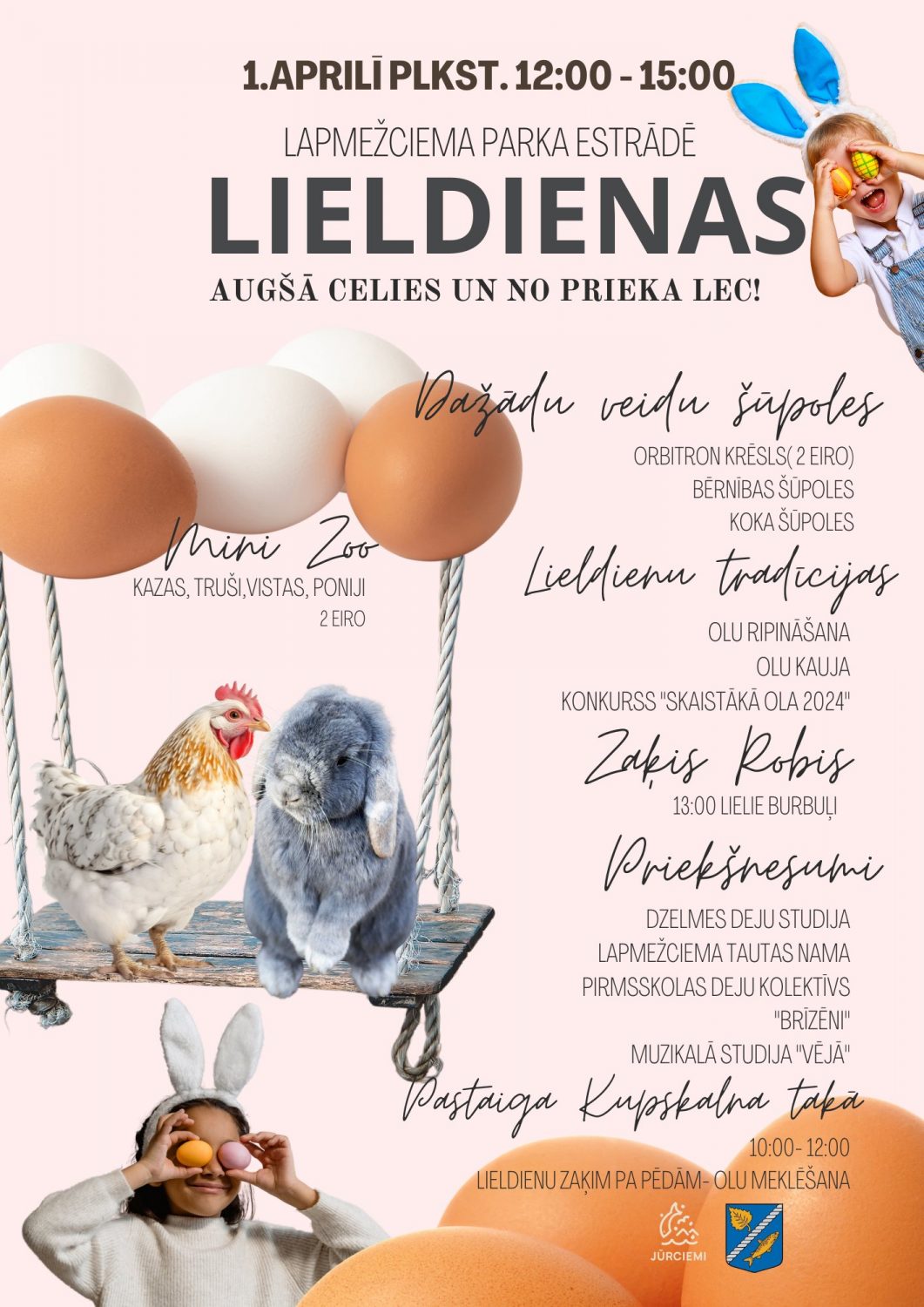 Arī Lapmežciema parka estrādē 1.aprīlī no pulksten 12:00 līdz 15:00 tiks svinētas Lieldienas. Pirms pasākuma kopā ar ģimeni ikviens aicināts aiziet līdz jūrai pa Kupskalna dabas taku, kur iespējams būs satikt Lieldienu zaķi. Piedalies arī konkursā “Lieldienu zaķim pa pēdam” – saskaiti, cik olas ir paslēptas takā! Uz pasākumu tā organizatori aicina ņemt līdzi arī savu skaistāko Lieldienu olu, lai varētu piedalīties izstādē! Būs iespēja iegādāties kārumus, izjāt ar poniju, kā arī izbaudīt ekstrēmas šūpoles.