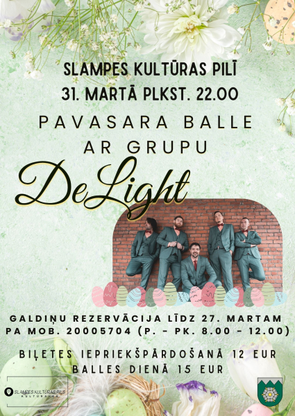 Bet 31.martā pulksten 22.00 Pavasara balle ar grupu “De Light” būs Slampes Kultūras pilī. Biļetes iepriekšpārdošanā iespējams iegādāties Slampes Kultūras pils kasē. Galdiņu rezervācija līdz 27. martam zvanot pa tālruni 20005704.