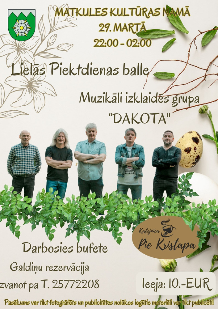 Lielās Piektdienas balle Matkules kultūras namā ar grupu “Dakota” būs 29.martā no pulksten 22:00. Galdiņu rezervācija pa tālruni 25772208.