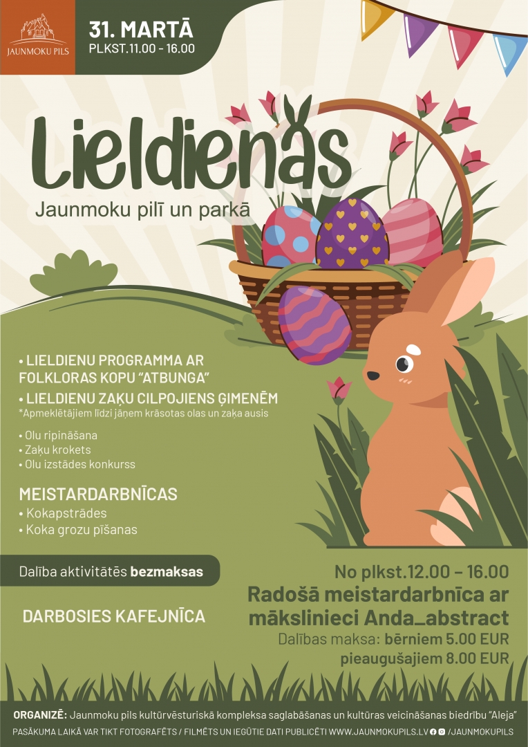 Pirmajās Lieldienās, 31. martā, Jaunmoku pils aicina visus uz aizraujošu svinību dienu pils parkā. Šīs dienas laikā norisināsies dažādas aktivitātes visai ģimenei – folkloras kopas “Atbunga” Lieldienu programma, olu ripināšana, zaķu cilpojiena sacensības, meistardarbnīcas un citas radošās Lieldienu nodarbes jau no pulksten 11.00. Plašāka pasākuma programma www.jaunmokupils.lv.