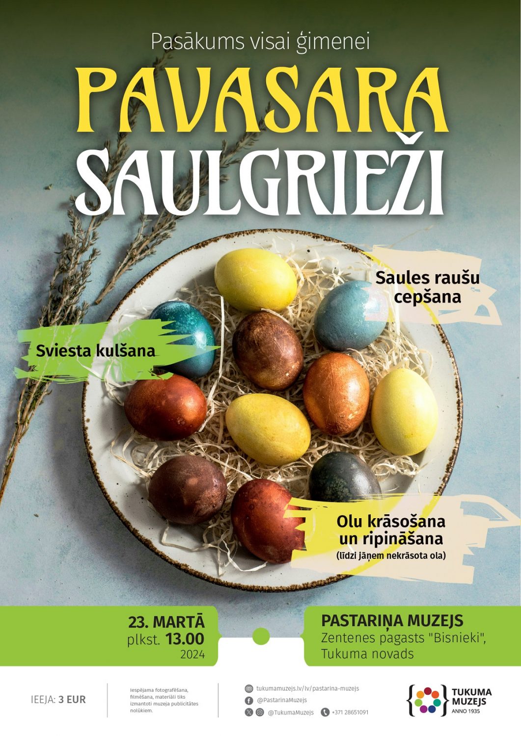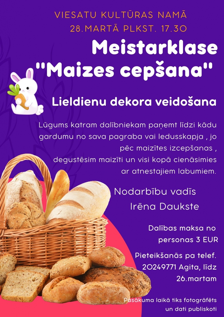 - martā pulksten 17.30 Viesatu Kultūras namā būs Lieldienu dekora darināšanas meistarklase “Maizes cepšana” ar meistari Irēnu Dauksti. Maizīti kopā tiks gan cepta, gan degustēta. Pieteikšanās līdz 26. martam pa tālruni 20249771 (Agita). Lai būtu vakars piepildītāks, lūgums katram dalībniekam līdzi paņemt “našķi” no sava pagraba. Adrese: Viesatu kultūras nams, “Viekaļas”, Viesatas, Viesatu pag., Tukuma novads.