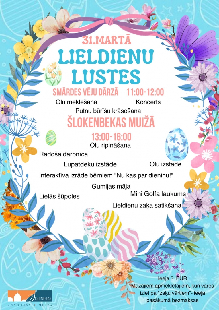 Vēl 31. martā Lieldienas tiks svinētas arī Smārdes pagastā. Svinības norisināsies divās vietās: “Vēju dārzā” un Šlokenbekas muižā. No pulksten 11.00 līdz 12.00 Smārdes parkā “Vēju dārzs” būs koncerts, radošās aktivitātes, olu meklēšana, ripināšana, šūpošanās. Ieeja bez maksas. Bet no pulksten 13.00 līdz 16.00 Lieldienas svinētas tiks Šlokenbekas muižā, kur paredzēts pasākums gan lieliem, gan maziem – interaktīva izrāde bērniem “Nu kas par dieniņu!”, olu ripināšana, olu izstāde, šūpošanās, gleznošanas darbnīca, piepūšamās atrakcijas, spēles un vēl citas aktivitātes.