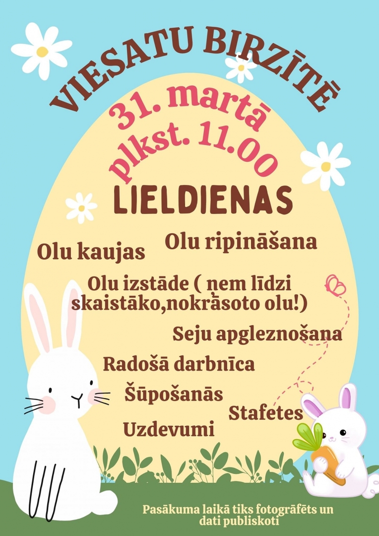 Viesatu birzītē 31.martā pulksten 11.00 Lieldienas tiks svinētas ar dažādām aktivitātēm, bez kurām Lieldienas nav iedomājamas. Būs olu kaujas, olu ripināšana, seju apgleznošana, radošā darbnīca, olu izstāde, šūpošanās, stafetes un citi uzdevumi. A
