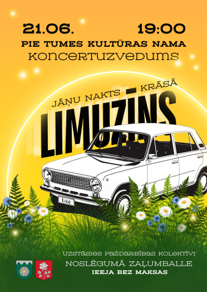 Tumē šogad, 21. jūnijā paredzēts ekskluzīvs koncertuzvedums “Limuzīns Jāņu nakts krāsā”. Koncerts norisināsies pie Tumes kultūras nama (sliktu laika apstākļu gadījumā iekštelpās), pulksten 19:00. Koncertā uzstāsies un piedalīsies Tumes kultūras nama kolektīvi: TDK “Solis”, Tumes jauktais koris, Sieviešu vokālais ansamblis “Kansoneta”. Jautrība garantēta! Pēc koncerta zaļumballe ar foršiem muzikantiem.