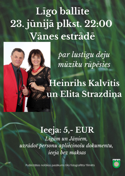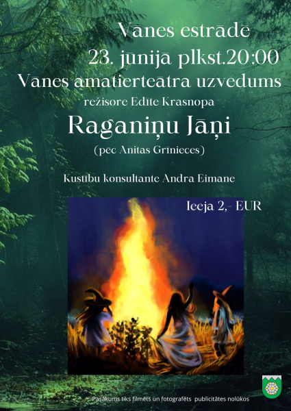 Vānes estrādē 23.jūnijā pulksten 20:00 būs skatāma Vānes amatierteātra izrāde “Raganiņu Jāņi”. Ieeja 2 EUR. Bet balle būs no pulksten 22:00, par labu noskaņojumu un mūziku parūpēsies Heinrihs Kalvītis un Elita Strazdiņa. Ieeja 5 EUR. Līgām un Jāņiem, uzrādot personu apliecinošo dokumentu, ieeja bez maksas.