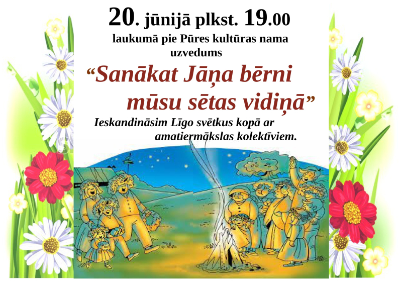 Līgo svētku ieskandināšana Pūrē būs 20.jūnijā pulksten 19:00 laukumā pie Pūres kultūras nama ar uzvedumu “Sanākat Jāņa bērni mūsu sētas vidiņā”. Svētku ieskandināšana būs kopā ar amatiermākslas kolektīviem.