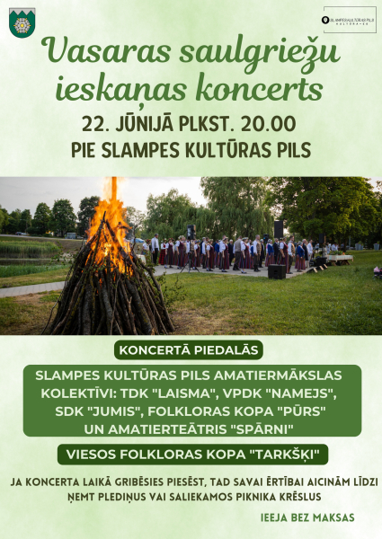 Vasaras saulgriežu ieskaņas koncerts būs arī pie Slampes kultūras pils 22.jūnijā pulksten 20:00. Koncertā piedalīsies Slampes kultūras pils amatiermākslas kolektīvi un amatierteātris “Spārni”, kā arī viesi – folkloras kopa “Tarkšķi”.