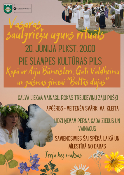 Vasaras saulgriežu uguns rituāls pie Slampes kultūras pils būs 20.jūnijā pulksten 20:00 kopā ar Aiju Būmeisteri, Gati Valdheimu un gaismas ģimeni “Baltās dūjas”.