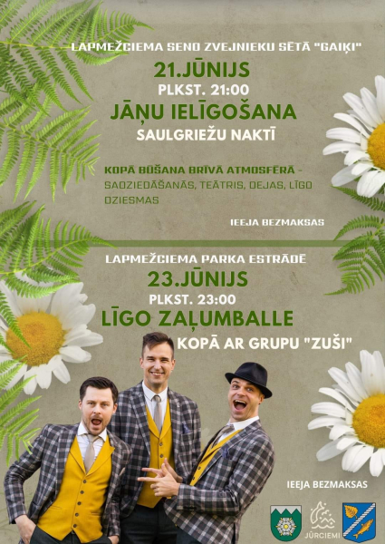 Bet Līgo zaļumballe Lapmežciema parka estrādē būs tieši 23.jūnijā no pulksten 23:00 ar grupu “ZUŠI”. Ieeja bezmaksas.