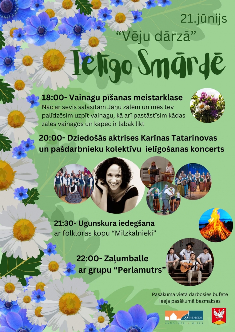 21.jūnijā no pulksten 18:00 būs ielīgošanas pasākums Smārdes “Vēju dārzā”. Pulksten 18:00 būs vainagu pīšanas meistarklase, pulksten 20:00 – dziedošās aktrises Karīnas Tatarinovas un pašdarbnieku kolektīvu koncerts. Savukārt pulksten 21:30 būs ugunskura iedegšana kopā ar folkloras kopu “Milzkalnieki”, bet jau 22:00 – zaļumballe ar grupu “Perlamutrs”. Darbosies bufete. Ieeja pasākumā – bezmaksas.
