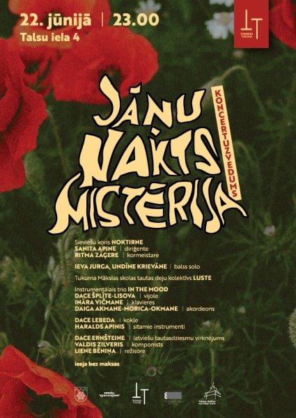 Bet 22.jūnijā pulksten 23:00 būs baudāms dziesmu cikls “Jāņu nakts mistērija” Talsu ielā 4, Tukumā. Šis dziesmu cikls īpaši rakstīts Tukuma pilsētas Kultūras nama sieviešu korim “Noktirne”. Ciklā pamatā izmantotas latviešu tautasdziesmas, kas pierakstītas Tukumā novadā. Ieeja bez maksas.