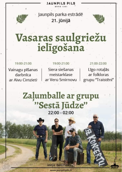 Bet Jaunpils parka estrādē 21.jūnijā no pulksten 19:00 ielīgošanas pasākuma ietvaros būs iespēja piedalīties dažādās aktivitātēs, tostarp siera siešanas meistarklasē, kurā varēsiet apgūt tradicionālās siera siešanas prasmes. Papildus būs iespēja pīt vainagus un baudīt rotaļas, Līgo rituālus folkloras grupas “Traistēni” vadībā. Zaļumballe kopā ar grupu “Sestā Jūdze” no pulksten 22:00 – 02:00. Pasākums ir bezmaksas.