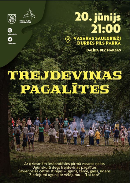 Ar dziesmām ieskandēsies pirmā vasaras nakts 20.jūnijā pulksten 21:00 Durbes estrādē Tukumā. Ugunskurā degs trejdeviņas pagalītes. Savienosies četras stihijas – uguns, zeme, gaiss, ūdens. Ziedojumi ugunij ar vēlējumu – “Lai top!”. Dalība bez maksas. ​Vasaras sākums šogad iestāsies 20. jūnijā pulksten 23:51. Vairāk informācijas www.tukumakn.lv