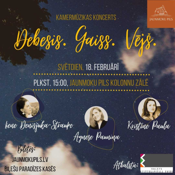 Bet cilvēka un dabas mijiedarbības poētiska apcere būs piedzīvojama Jaunmoku pilī 18. februārī pulksten 15:00 kamermūzikas koncertā “Debesis. Gaiss. Vējš.”. Uz skatuves satiksies Trio Spectrum – dziedātāja Agnese Pauniņa, flautiste Liene Denisjuka – Straupe un pianiste Kristīne Paula. Koncertā pamīšus skanēs gan franču, gan latviešu komponistu darbi, kas šajā kombinācijā brīnišķīgi izcels katra skaņdarba unikālās krāsas un saturisko vēstījumu. Vairāk informācijas www.jaunmokupils.lv. A
