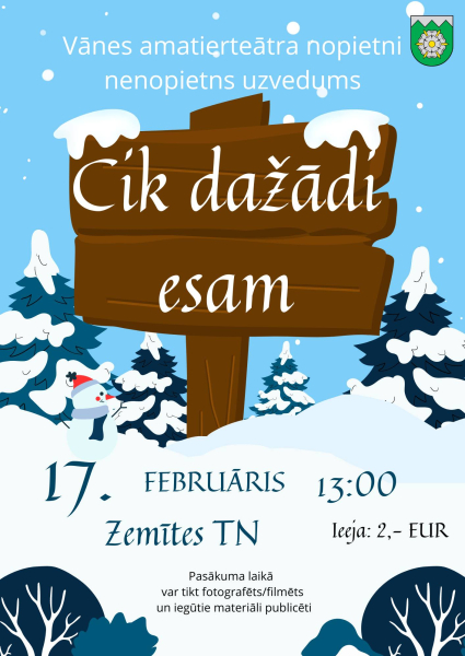 Bet Vānes amatierteātra nopietni nenopietnā izrāde “Cik dažādi esam” būs skatāma Zemītes tautas namā 17.februārī pulksten 13:00. Ieeja 2 EUR.