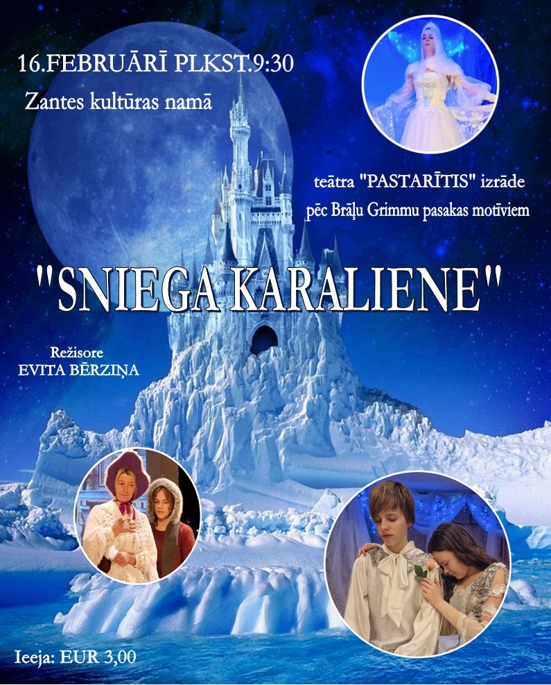 - februārī pulksten 9:30 Zantes kultūras namā būs skatāma Cēres bērnu un jauniešu teātra “Pastarītis” izrāde “SNIEGA KARALIENE”. Ieeja 3 EUR.