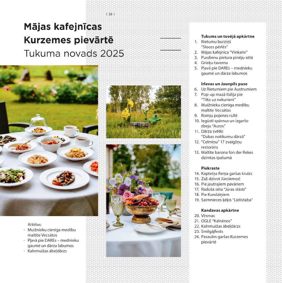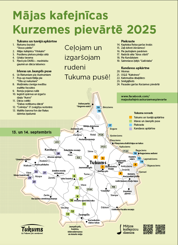 Tukumā pie sevis mājas kafejnīcā “Sloces pērles” uzņems Anita Vugule, šoreiz piedāvājot kantrī stila noskaņu savā dārzā. Tukuma pievārtē, Sēmes pusē mājas kafejnīcā “Vīnkalni” saimniekos Ketija Baldzēna, aicinot izbaudīt rudens aveņu valdzinājumu, bet Milzkalna tuvumā –Lolita un Pēteris Tutāni piedāvās “Pusdienu pieturu pinēju sētā”, kur pamieloties ar ēdienu, kā arī iepazīt pinēju arodu. Savukārt Smārdē pie Raivja Čilipāna atkal darbosies “Grieķu taverna”. Turpat netālu – Antiņciemā Sanita Matule Ķemeru Nacionālā parka ielokā veidos mājas kafejnīcu “Pļavā pie DAREs – Mednieka gaumē un dārza labumos”.